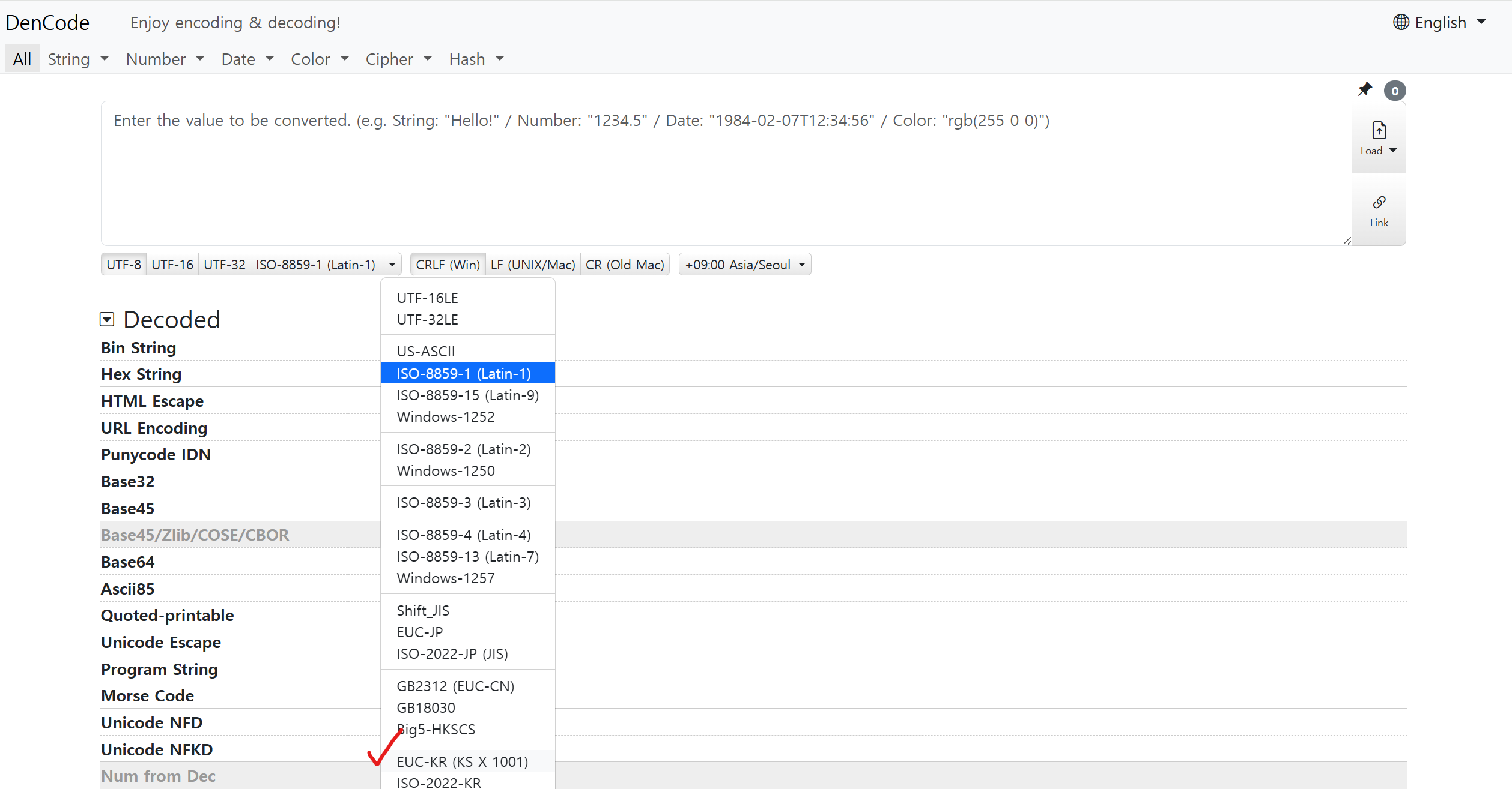 [데이터] EUC-KR EUC-KRKS X 1001 KS X 1003 문자집합 기반의 한글 인코딩 방식이다.완성형 인코딩 방식문자 하나에 2 Byte 크기의 코드를 부여한다.2바이트는 16비트이므로, 다시 말해 4자리짜리 16진수가 필요하다.(ex) "가" = b0a1EUC-KR을 체험할 수 있는 사이트 : https://dencode.com/ (광고X)운영체제에 따라 CRLF / LF / CR 중 하나를 선택 -> EUC-KR (KS X 1001) 클릭 IT 관련 지식/컴퓨터구조 + 운영체제 2024.12.08